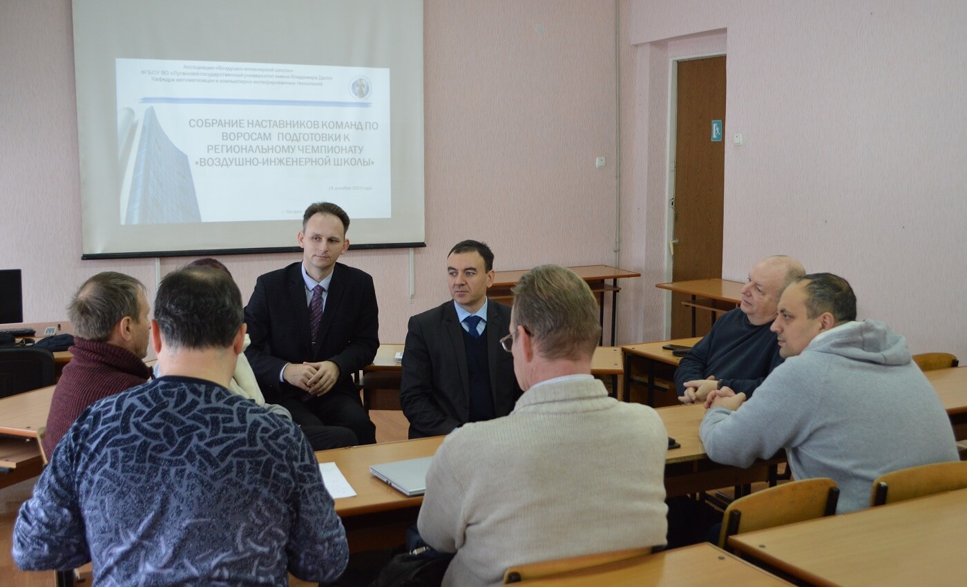 24 декабря 2023 г. на базе кафедры автоматизации и компьютерно-интегрированных технологий состоялось собрание наставников команд по вопросам подготовки к Луганскому Региональному Чемпионату «Воздушно-инженерной школы». В совещании приняли участие руководитель проекта Алексей Андрианов, координатор Анна Евдокимова, заведующий кафедрой автоматизации и компьютерно-интегрированных технологий Андрей Колесников, доценты кафедры АКИТ Артур Воронов и Олег Малахов, доцент кафедры прикладной математики Дмитрий Остапущенко, а также наставников команд учебных заведений ЛНР.