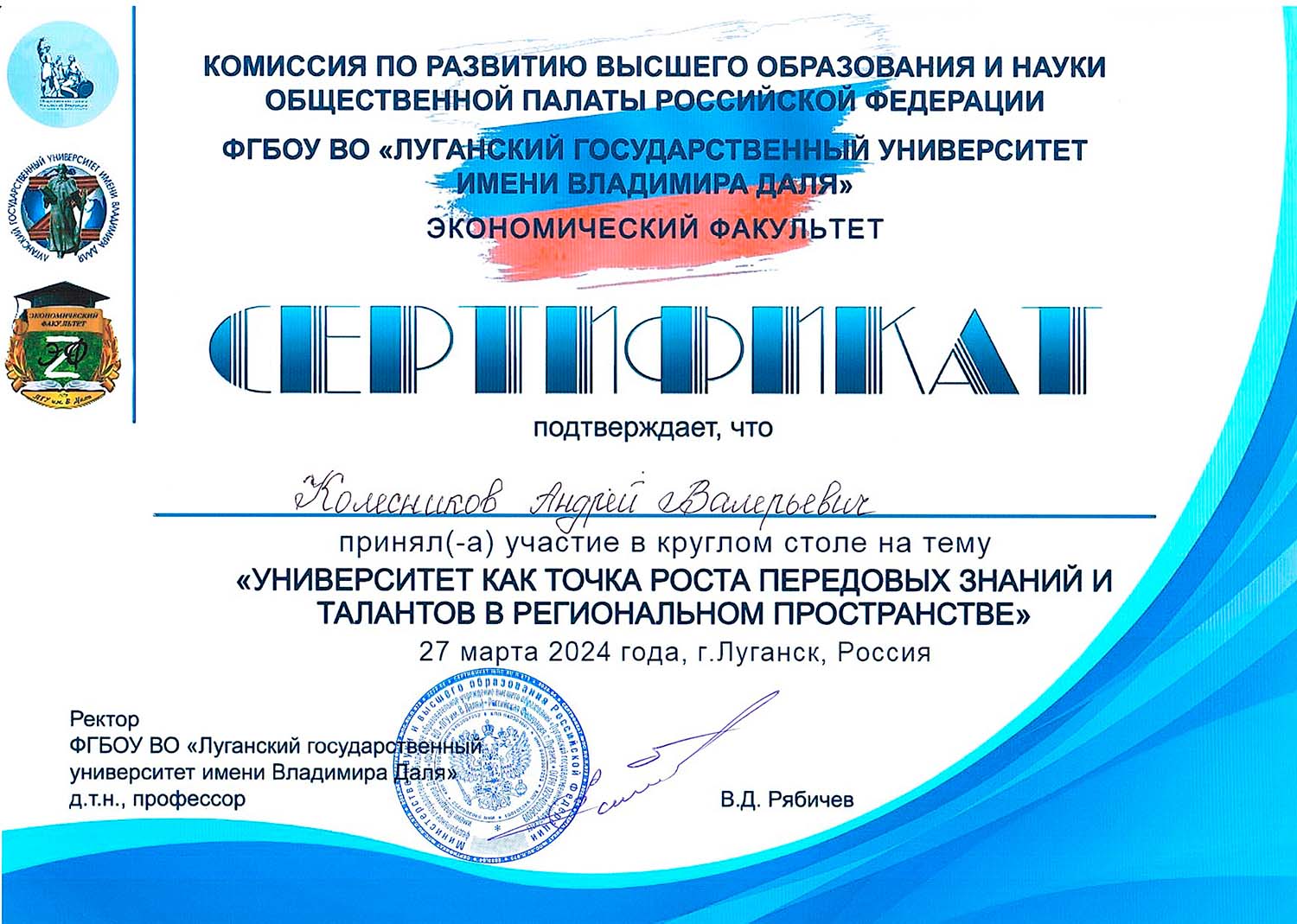 В работе круглого стола приняли участие: член Комиссии по развитию высшего образования и науки Общественной палаты РФ, ректор ФГБОУ ВО «ЛГУ им. В. Даля» Виктор Рябичев; председатель Общественной палаты ЛНР Алексей Карякин; медиаменеджер представительства автономной некоммерческой организации «Россия – страна возможностей» Алина Заец; ученые, сотрудники и студенты Далевского университета, представители вузов РФ.