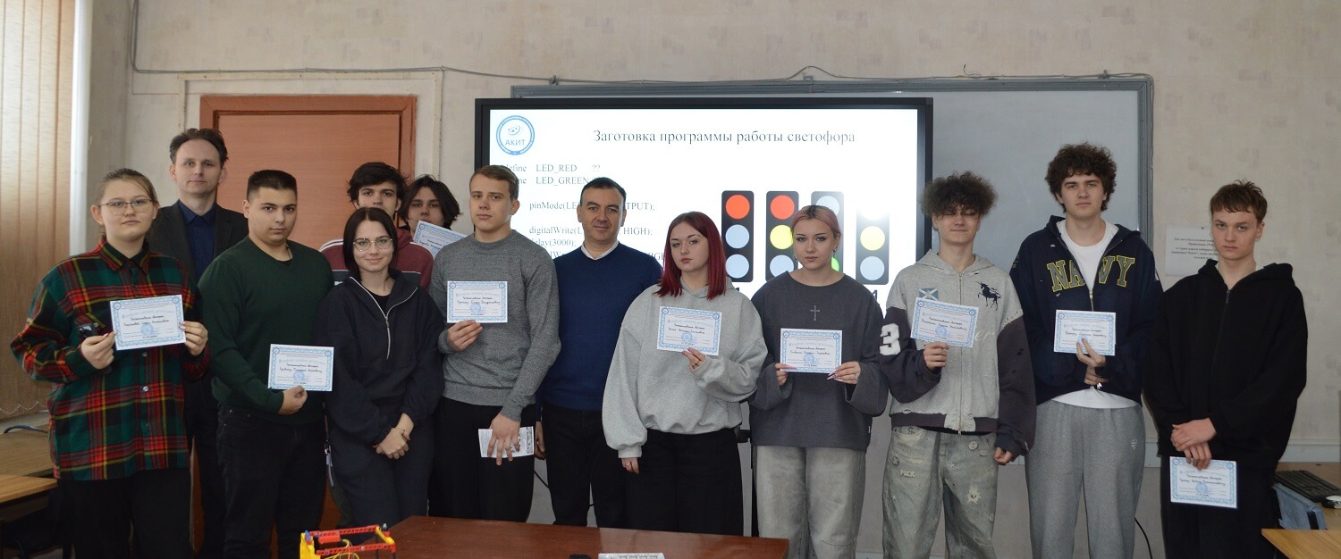 Проводили мастер-класс доцент Воронов Артур Эдуардович, старший преподаватель Сухов Денис Александрович и студенты кафедры АКИТ. Перед участниками была поставлена задача написать в среде Visual Studio Code программу на языке C++, которая позволяет управлять элементами, подключенными к микроконтроллеру платы цифровой лаборатории. Объектом управления был светофор. В результате ребята успешно справились с задачей, реализовав логическое управление автомобильным и пешеходным светофорами, дневной и ночной режим работы по сигналу от фоторезистора, подключение звукового сигнала для пешеходов.