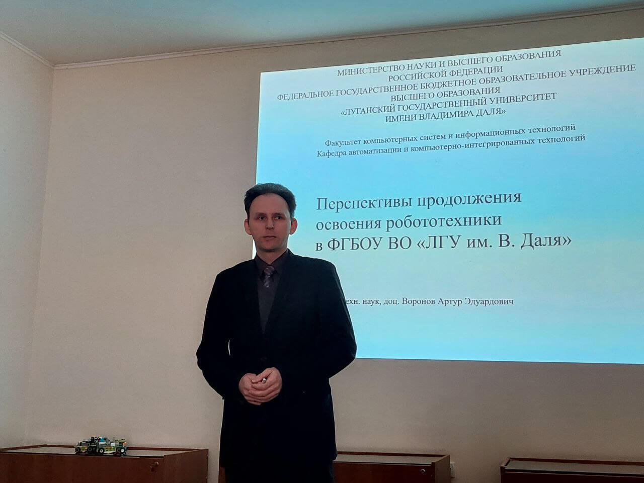 С перспективами продолжения освоения робототехники в процессе получения высшего образования на базе кафедры автоматизации и компьютерно-интегрированных технологий познакомил слушателей доцент кафедры Артур Эдуардович Воронов.